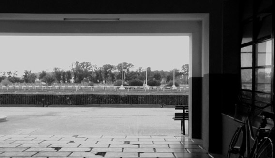 La imagen televisada se multiplica en los televisores, mientras que la pista, a través de las ventanas, se muestra vacÃa. El recorrido de los caballos se proyecta en el transcurrir de los estados por los que oscilan los apostadores.